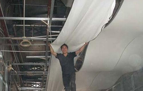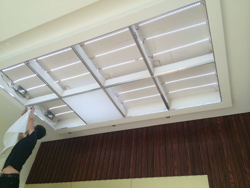 上面的步驟完成後,我們就可以開始安裝軟膜了。這裏需要註意的的是,壹定要保證軟膜幹凈無損壞,同時無雜質和無明顯的浮塵覆蓋。首先把軟膜打開,其次用熱風炮把它充分加熱至均勻,接著用插刀把軟膜緊緊的插在鋁合金龍骨上。最後再把四周多出的軟膜修整平整就好了,修整後的軟膜天花直接提升了居室的美觀。